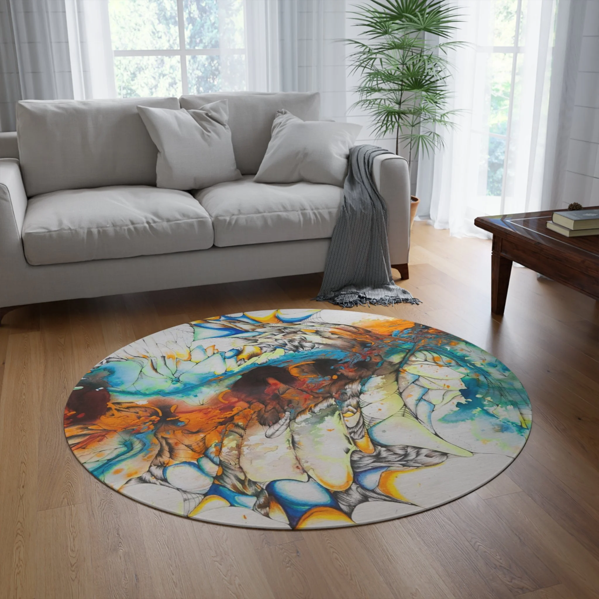 Decorative rugs with fun, bright designs have made a huge comeback. Create a stunning design with graphics or funky characters, and print them on this round 100% polyester chenille rug in picture-perfect quality. It features a coated backing and hemmed edges for durability.