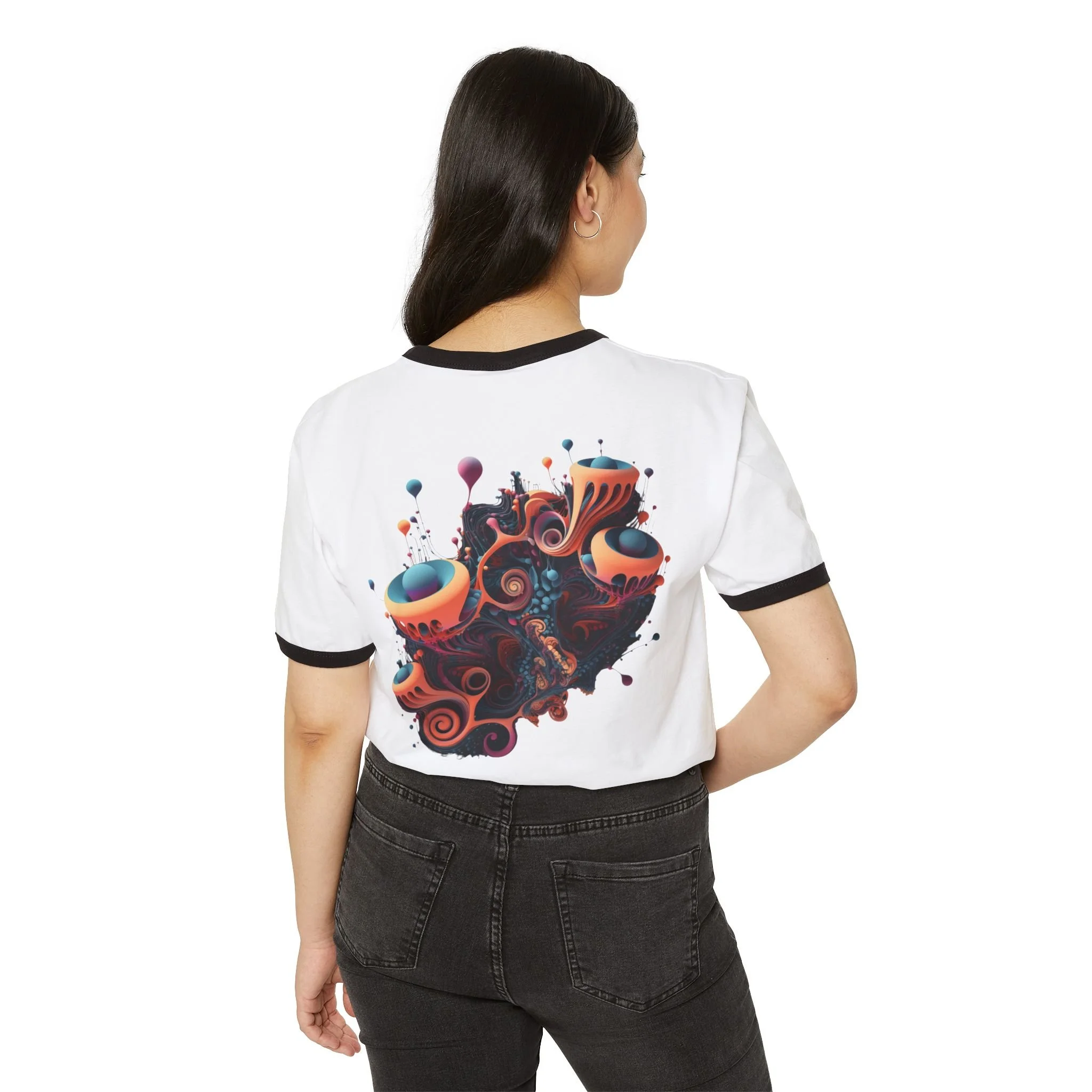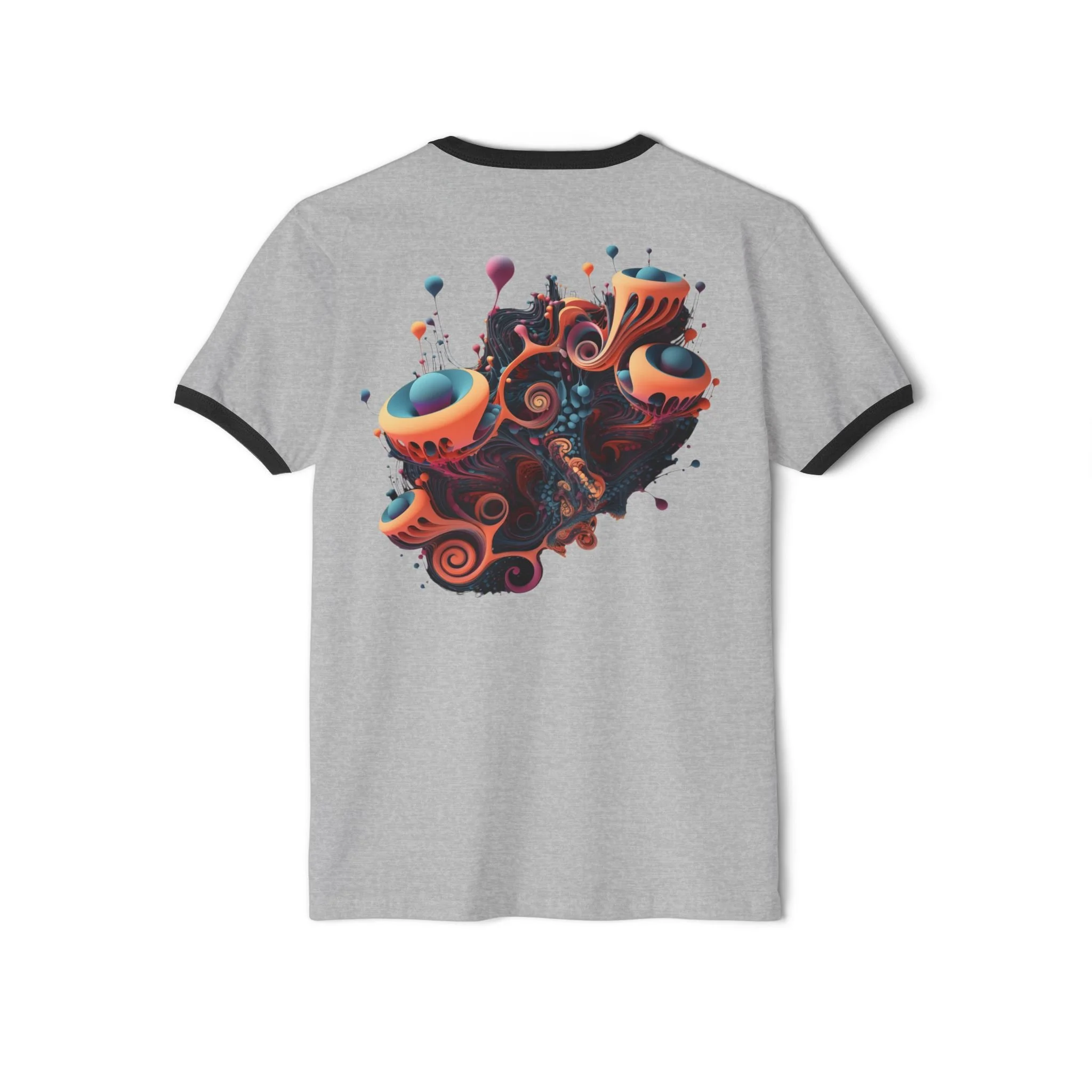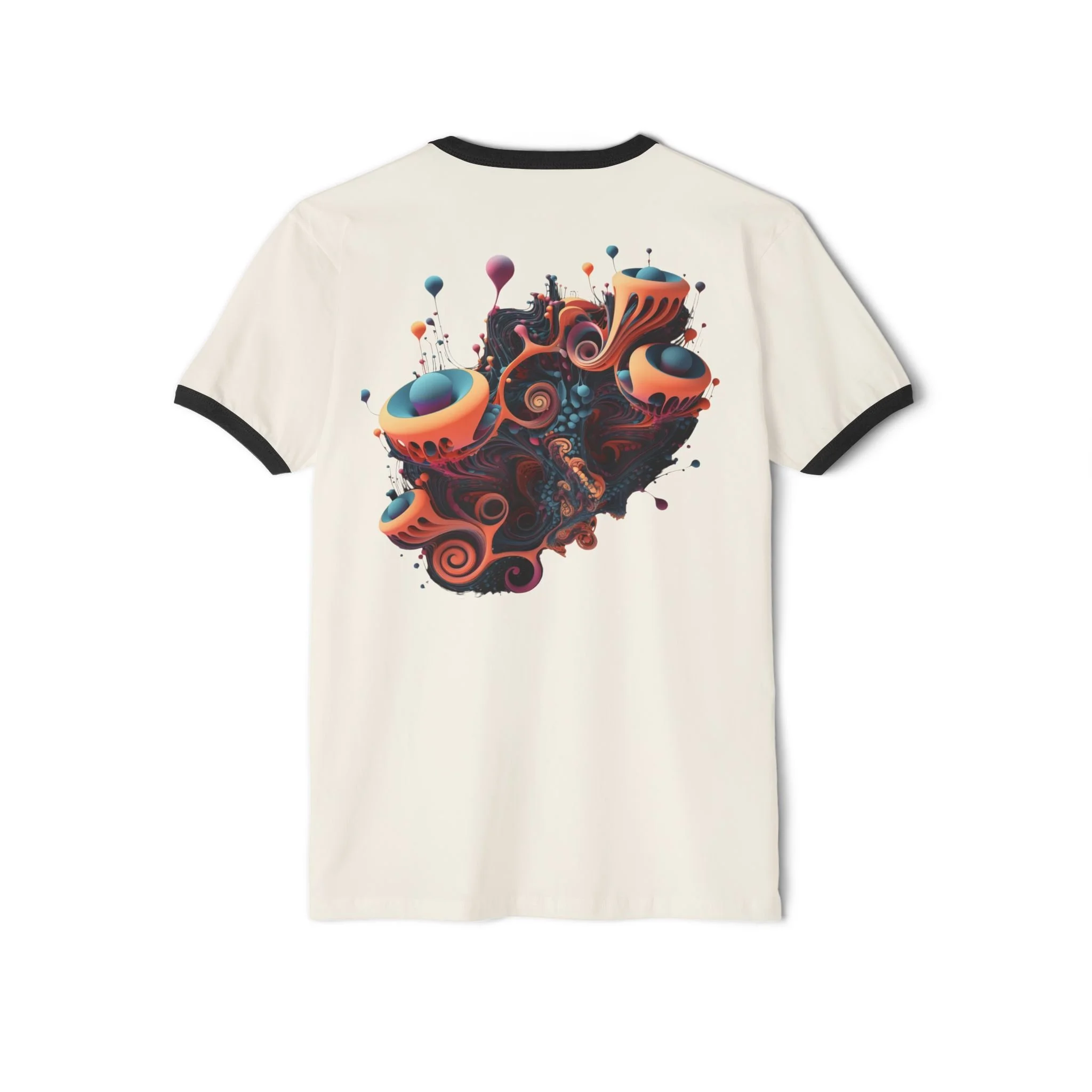 Retro Ringer T-Shirt — Bold 3D Logo Front & Surreal Abstract Back