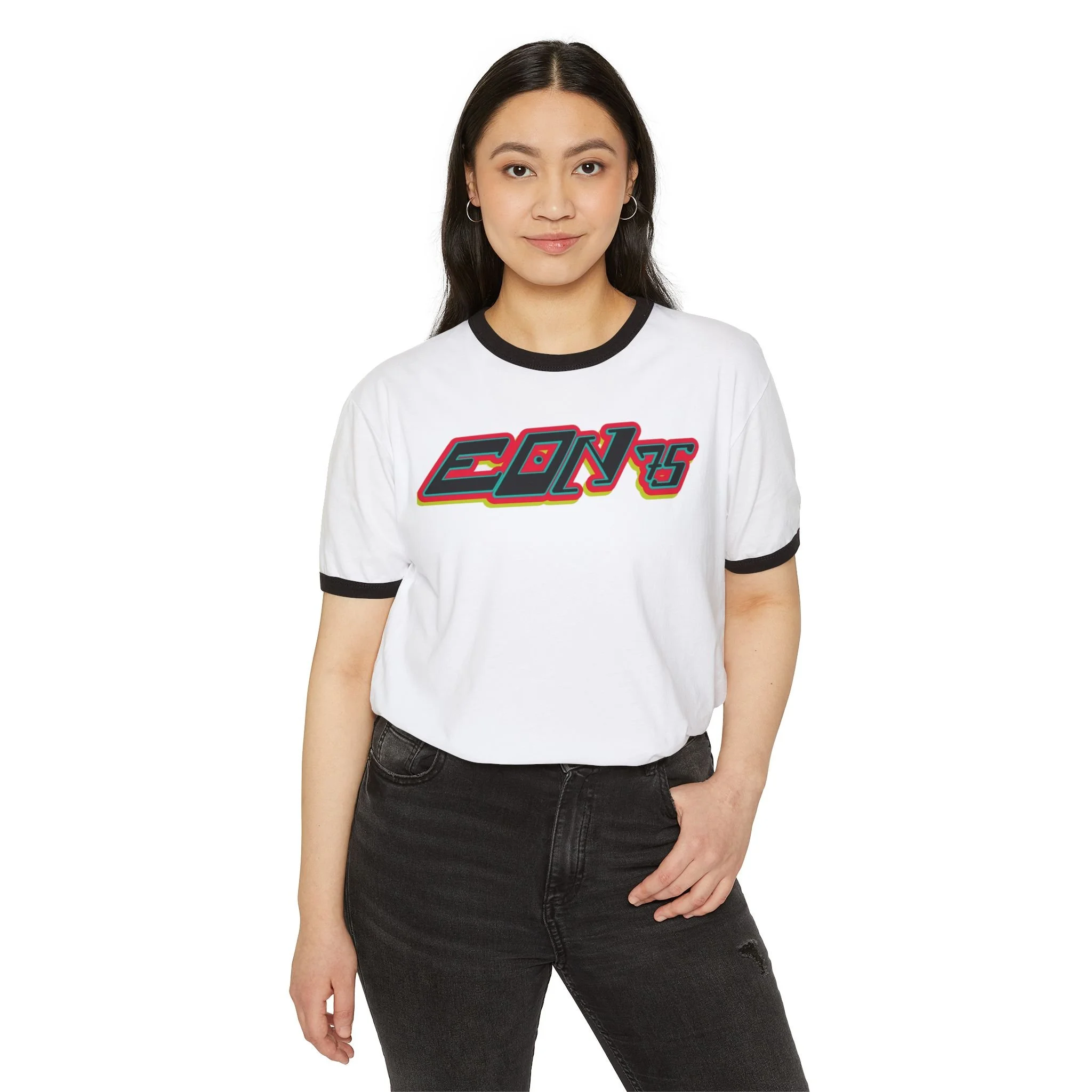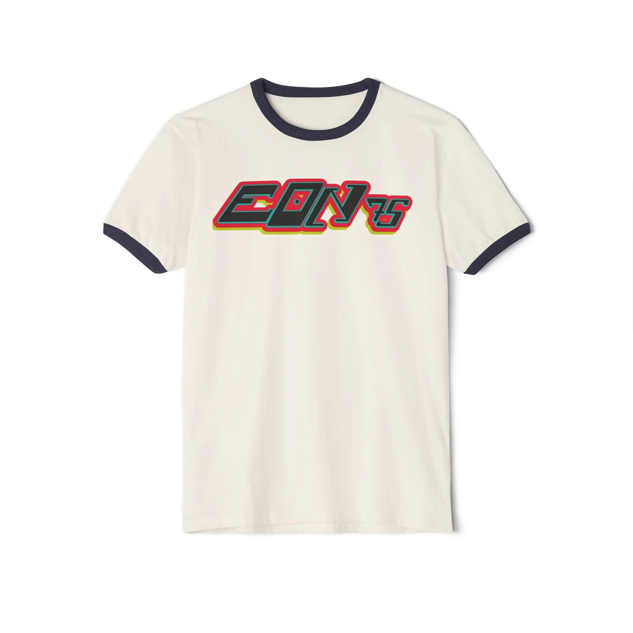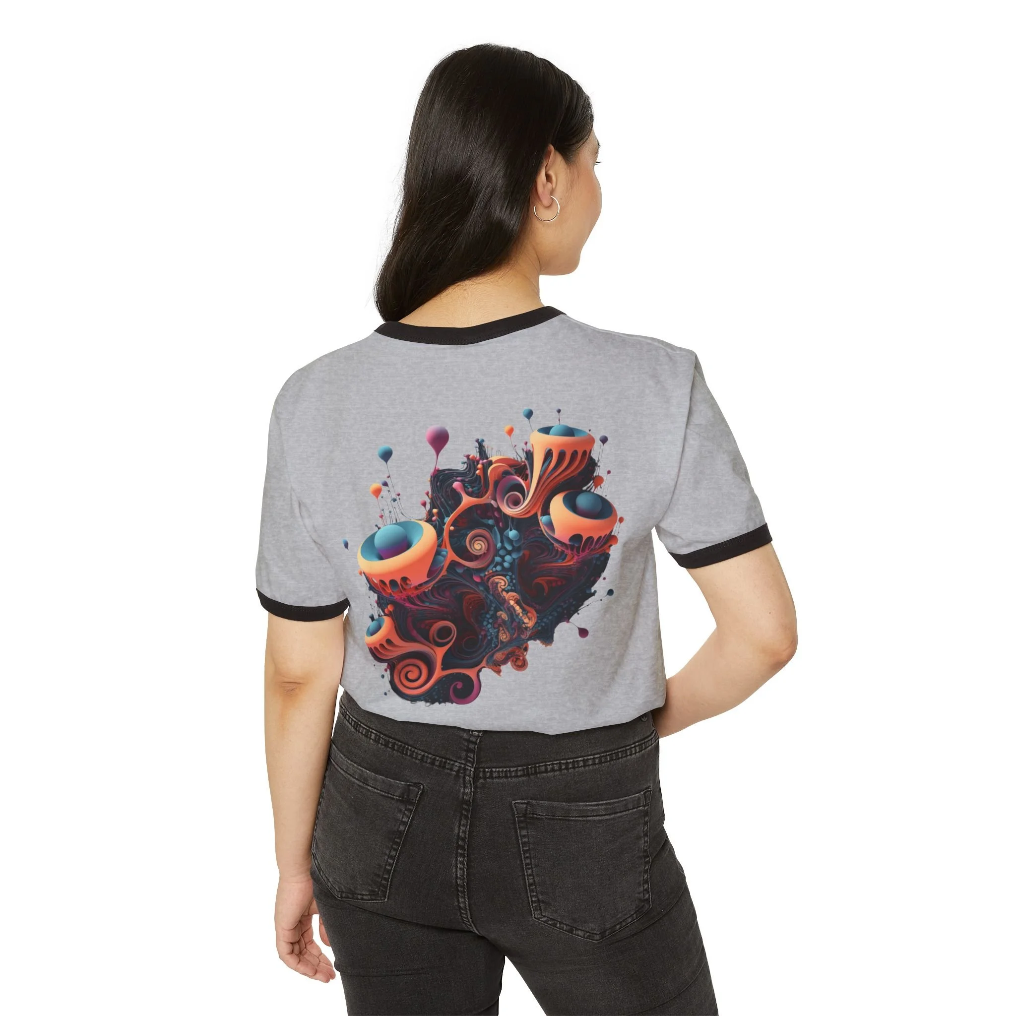 Retro Ringer T-Shirt — Bold 3D Logo Front & Surreal Abstract Back